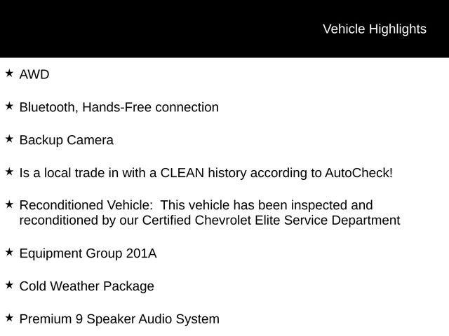 - Reconditioned Vehicle: This vehicle has been inspected and reconditioned by our Certified Chevrolet Elite Service Department