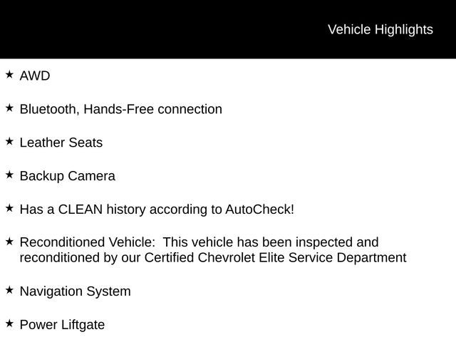 - Reconditioned Vehicle: This vehicle has been inspected and reconditioned by our Certified Chevrolet Elite Service Department