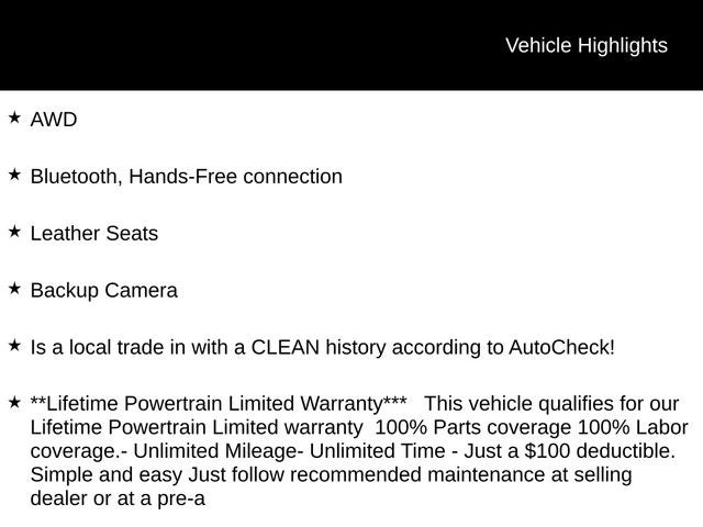 - **Lifetime Powertrain Limited Warranty*** This vehicle qualifies for our Lifetime Powertrain Limited warranty 100% Parts coverage 100% Labor coverage.- Unlimited Mileage- Unlimited Time - Just a $100 deductible. Simple and easy Just follow recommended maintenance at selling dealer or at a pre-a