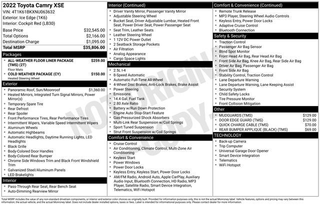 The Camry XSE is equipped with a host of premium features that elevate your driving experience. The All-Weather Floor Liner Package and Cold Weather Package provide added protection and comfort, while the Quick Charge Cable and Rear Bumper Applique offer convenient and stylish touches.